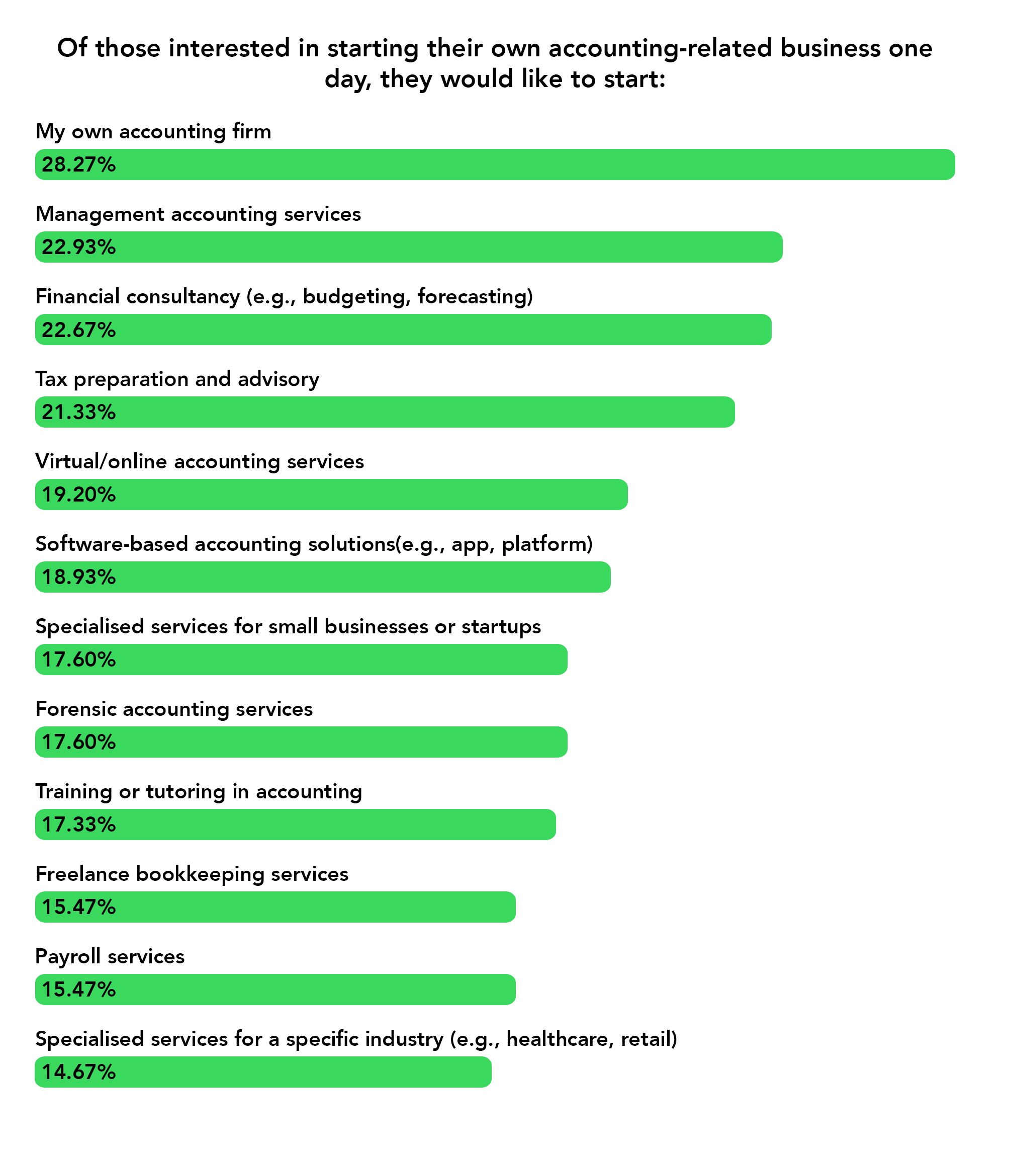 This preference for advisory-led work aligns with broader expectations: 30% of respondents see decision-making as a growing part of the accountant’s role, and 22% predict strategic advisory will become central to the profession over the next decade.