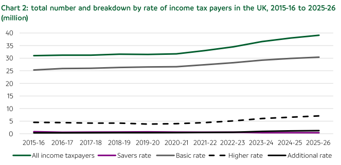 As the tax burden on high earners falls, the number of people paying income tax continues to climb. Nearly 2.9 million additional people will pay the basic rate in 2025-26, and over 2.6 million more will pay the higher rate.